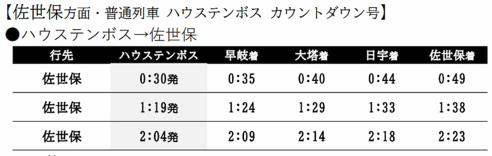 【ハウステンボス】0:30発 ⇒【佐世保】0:46着