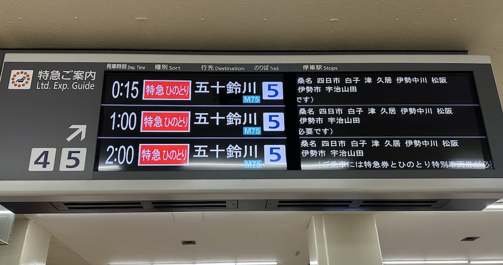 行き先案内板には普段見かけないであろう特急「ひのとり」五十鈴川行きの表示が3本。
