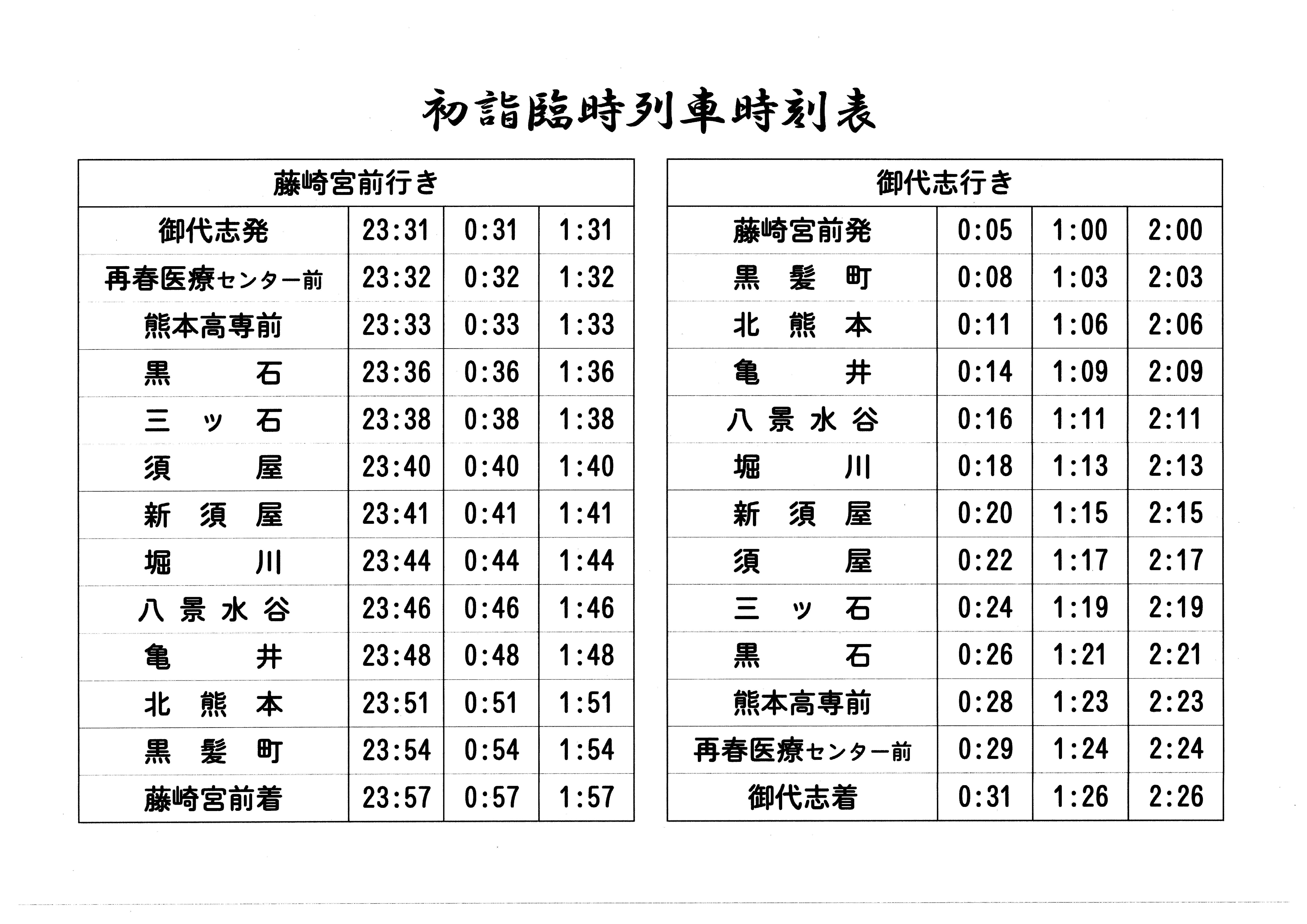 ・電鉄電車(御代志~藤崎宮前)で大晦日~元旦の深夜帯にかけて初詣臨時列車を運行
