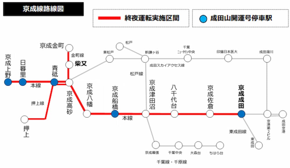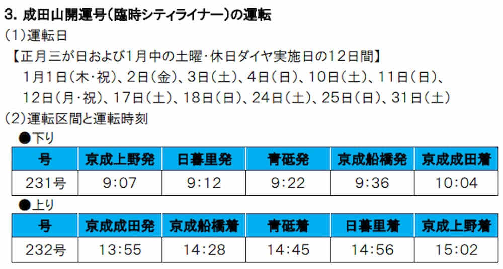 京成線は普通列車による終夜運転を実施。臨時シティライナー「成田山開運号」の運転も実施されます。